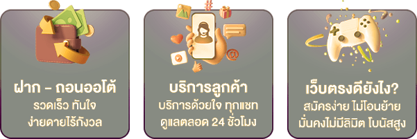 ตอบ : - ฝาก-ถอนอัตโนมัติตลอด 24 ชั่วโมง - รองรับทุกธนาคารหลักในไทย - ไม่มีขั้นต่ำในการฝาก-ถอน - ใช้เวลาดำเนินการไม่เกิน 3 นาที